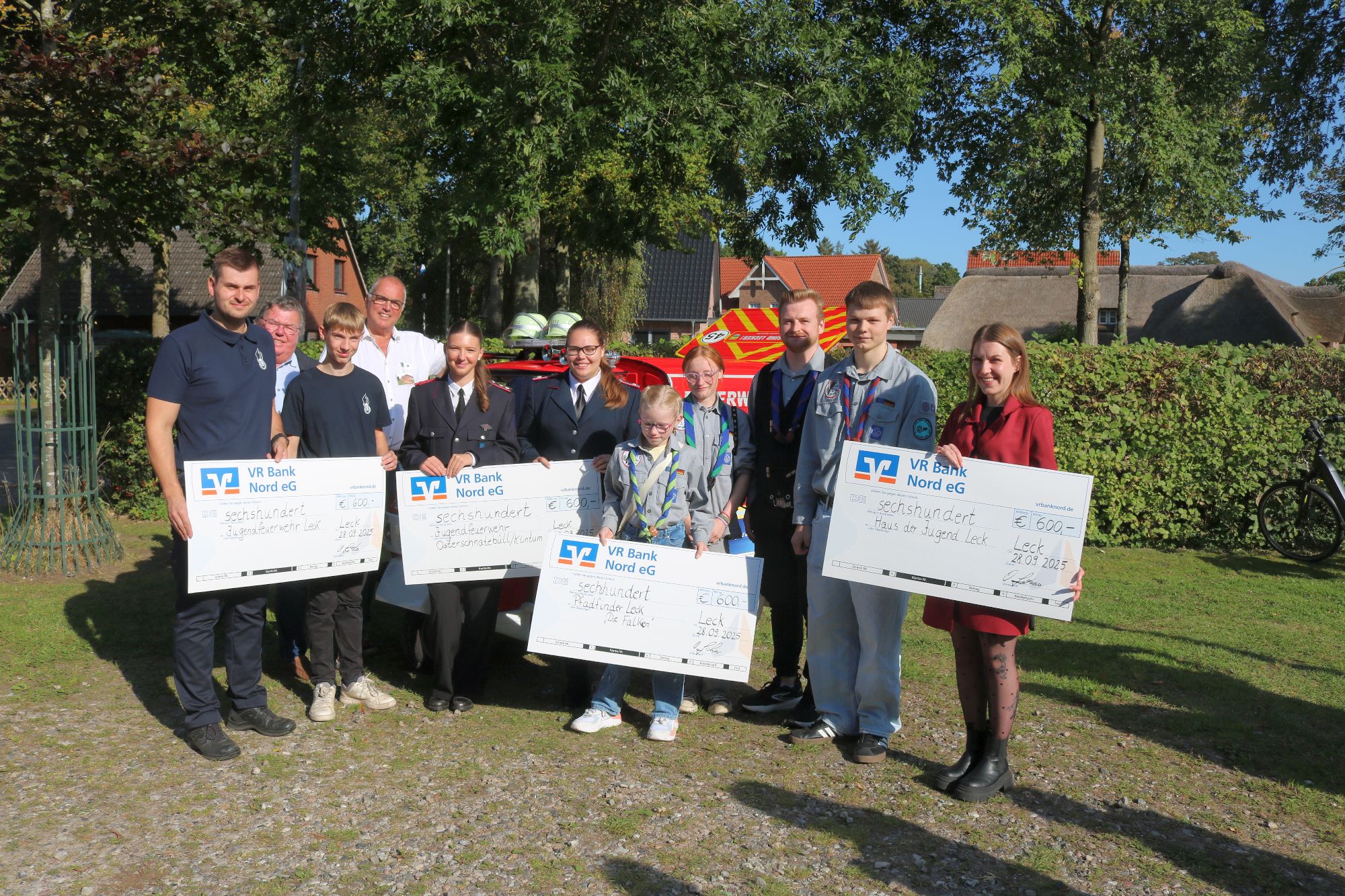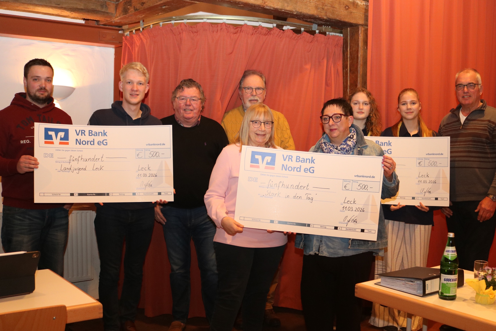 Beim Jubiläumsfest wurden alle Getränke und Speisen auf Spendenbasis abgegeben – es kamen über 2.000 € zusammen, die der Verein auf 2.400 € aufstockte. Auf dem Lecker Landmarkt am 28. September 2025 wurden je 600 € an die Jugendfeuerwehr Leck, die Jugendfeuerwehr Oster-Schnatebüll/Klintum, die Pfadfinder Leck und das Haus der Jugend Leck übergeben.